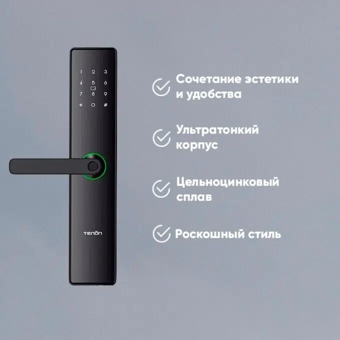 Электронный замок Tenon E15 сочетает в себе эстетику и удобство использования в «умном доме». Ультратонкий корпус из цельноцинкового сплава облегчает доступ к «умной жизни». Сенсорная панель большого размера с высоким разрешением позволяет точно отображать процесс управления. Электронный замок воплощает роскошный стиль в деталях.